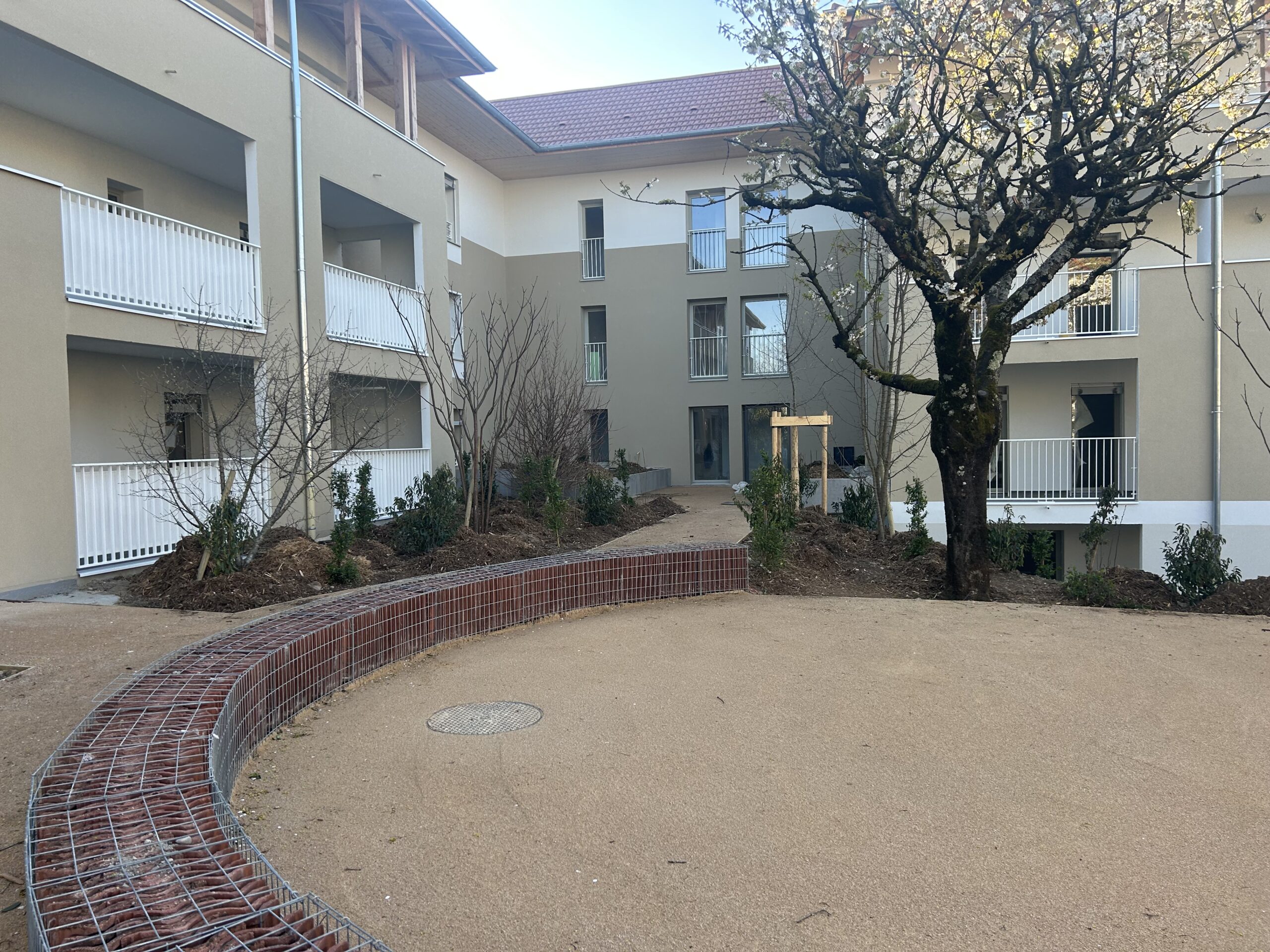 On en voit bientôt le bout ! A l’extérieur, il reste encore les mobiliers et quelques finitions… En tous cas les aménagements paysagers ont bien pris forme, et le résultat est très agréable à parcourir : on espère que ce cadre de vie satisfera les futurs habitants. Ici, le murets en gabions a été rempli avec les tuiles de la toiture qui a été déposée dans le cadre des travaux ; de l’autre côté, on a également réutilisé les pavés autobloquants existants sur site pour matérialiser les seuils au niveau de chaque entrée.
