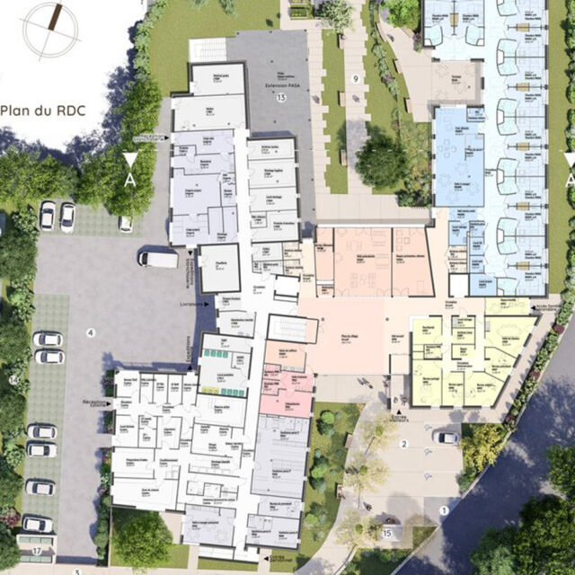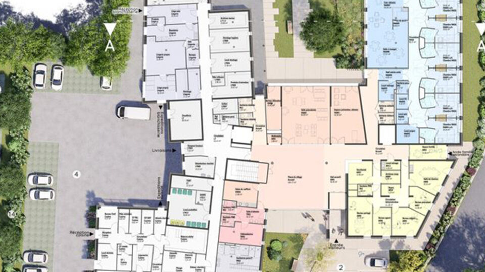Enfin, depuis le parking extérieur, un cheminement piéton traverse les bosquets conservés et permet aux visiteurs d’accéder directement à l’entrée de l’établissement et au personnel d’accéder à leurs locaux.